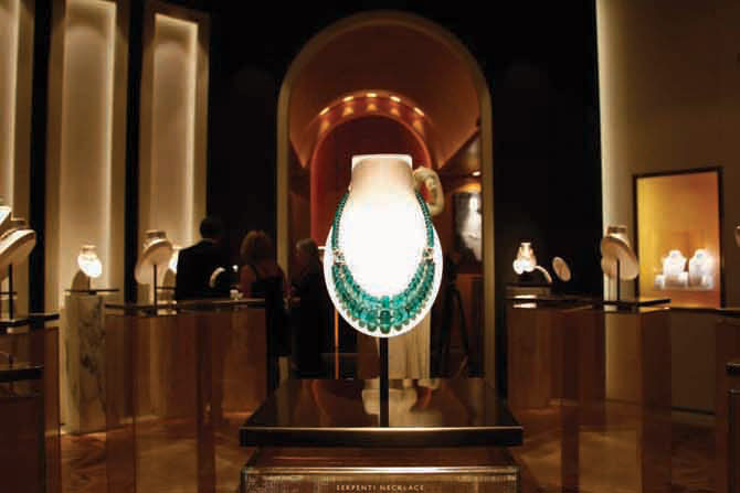 Lo stand Bulgari alla Biennale Grand Palais incanta con le opere esposte e i gioielli finemente lavorati. Il design dello stand, una fusione di lusso e modernità, accoglie i visitatori in un’atmosfera raffinata. Gli elementi architettonici esaltano la bellezza delle creazioni, creando uno spazio che riflette la maestria artigianale di Bulgari.